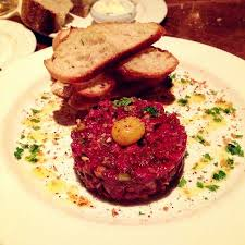 Then the waiter slipped a plate of raw meat in front of me. A round, Derby-hat shaped lump of ground beef–raw, like they just sliced open the cellophane and took this pile off of the green Styrofoam and flipped it onto the China plate. A sprig of parsley fell on the top. I looked at it a long time, thinking about the small chunks of raw meat my mother would let me have when she made hamburgers for a picnic, and how with each small amount she would say, “Not too much, you can get very ill from raw meat.”
