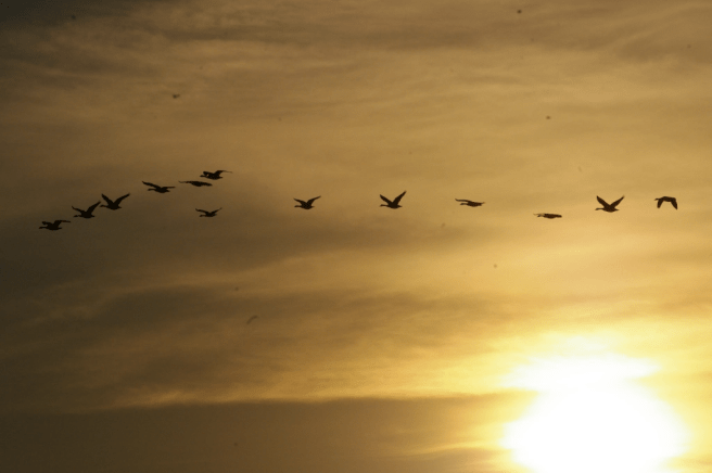 Owls, too—some barred but mostly screech owls, perch in the oaks and elms, sometimes swooping down and moving through branches with precision. But my favorite are the geese which cover the night sky in flocks sometimes so enormous the swoosh of their wings alone creates a breeze, and their call to “Go! Go! Go!” is startling.